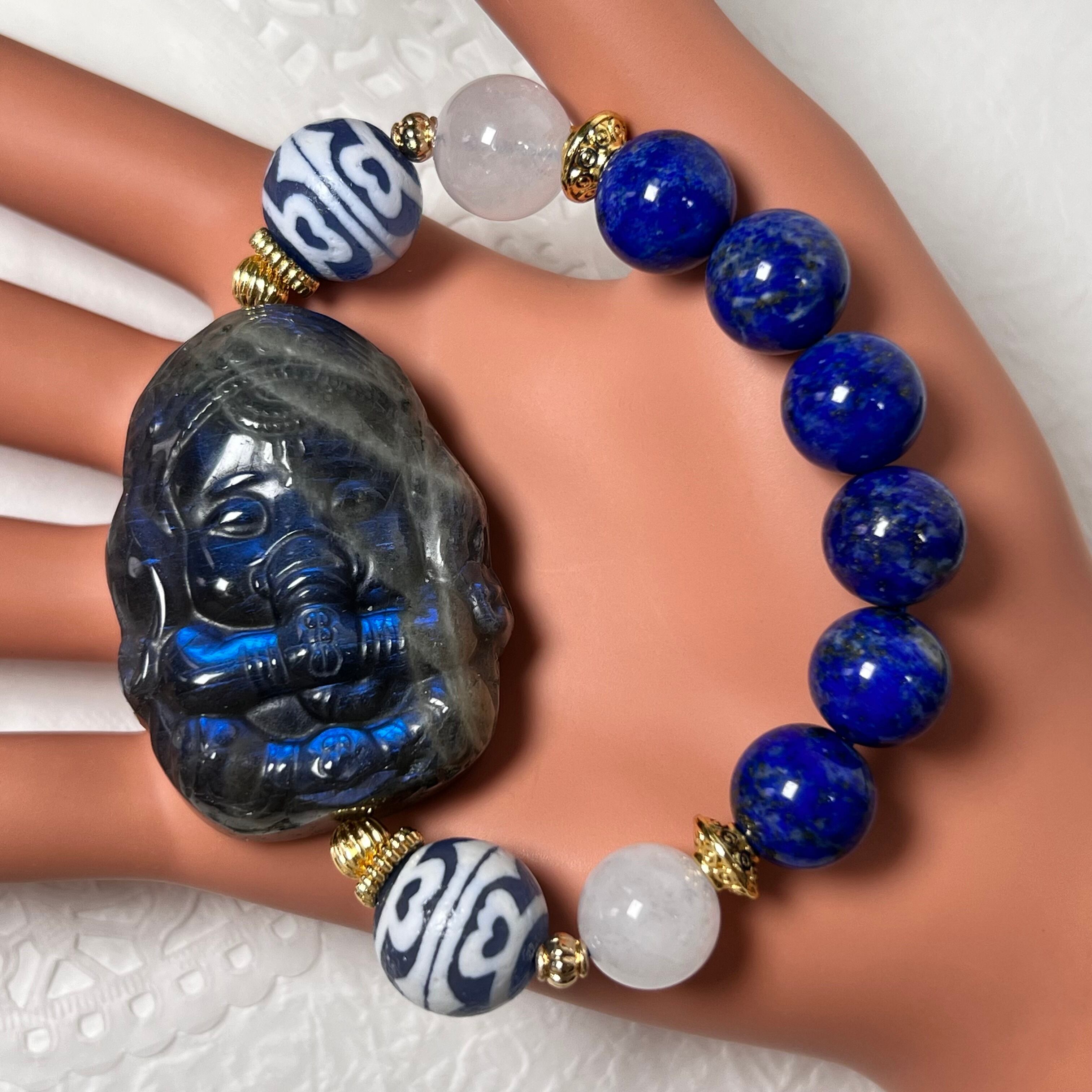 ブルーシラーの綺麗なラブラドライトのガネーシャと天珠を組み入れたブレスレット。