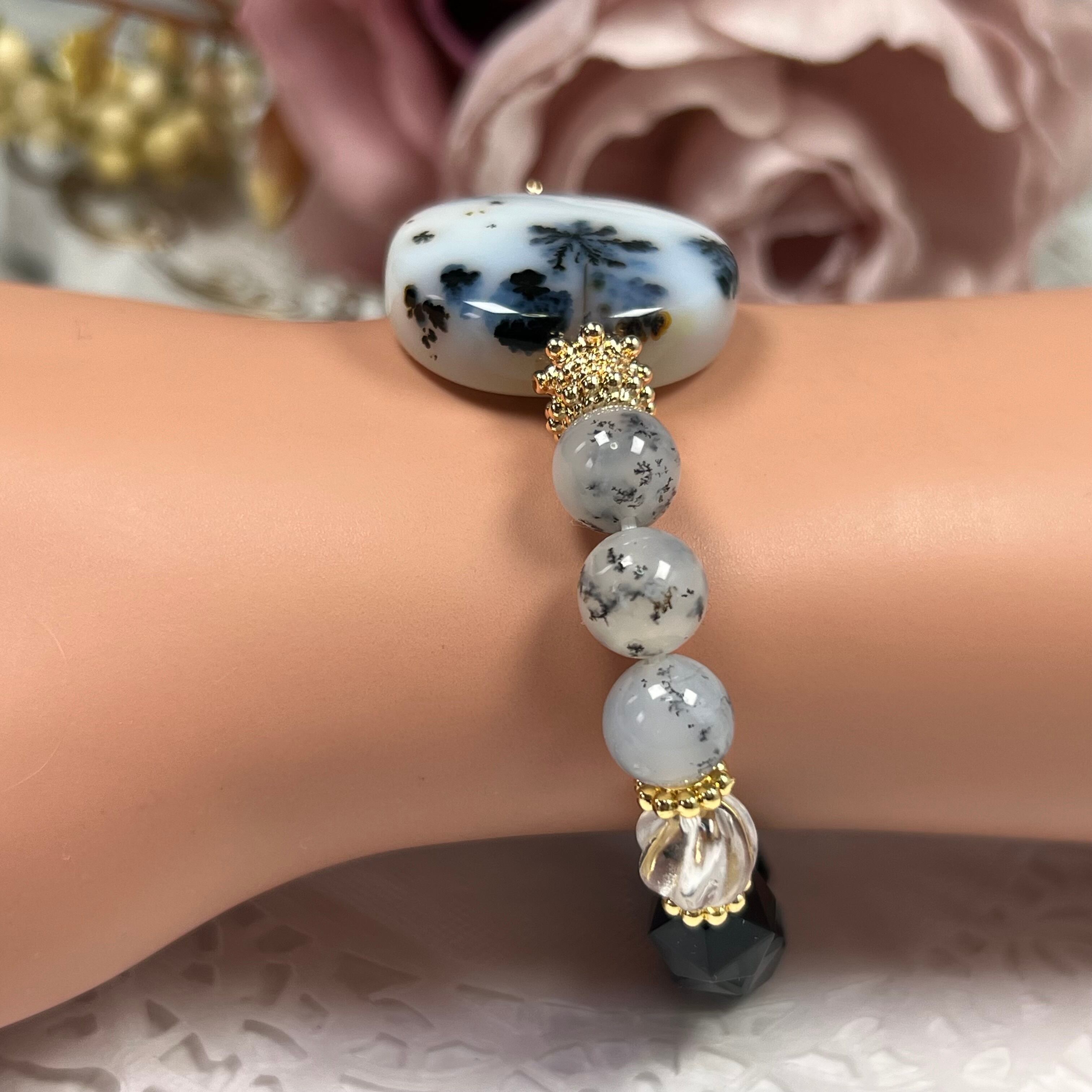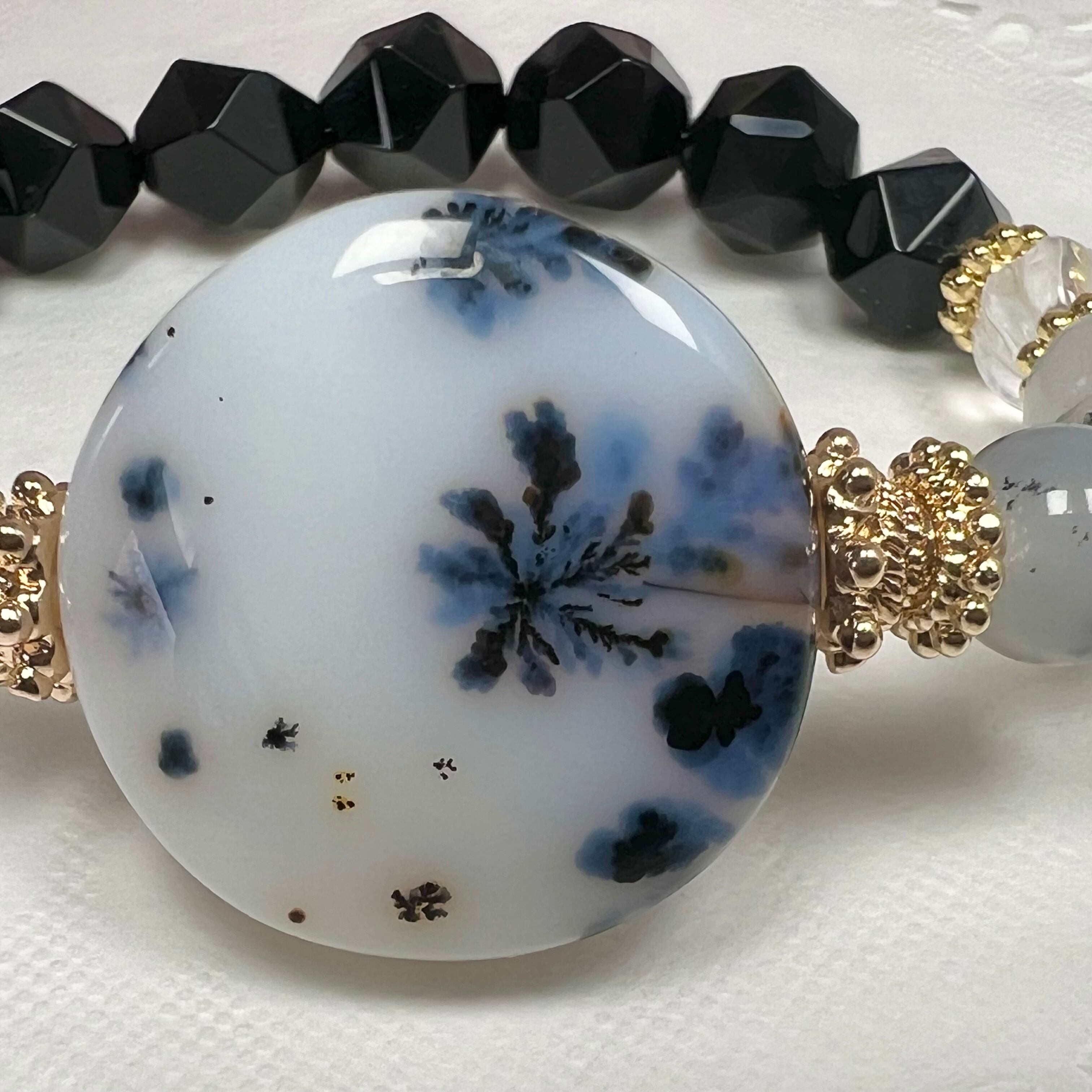 乳白色のデンドリクォーツ、オニキスカットのデザインブレスレット