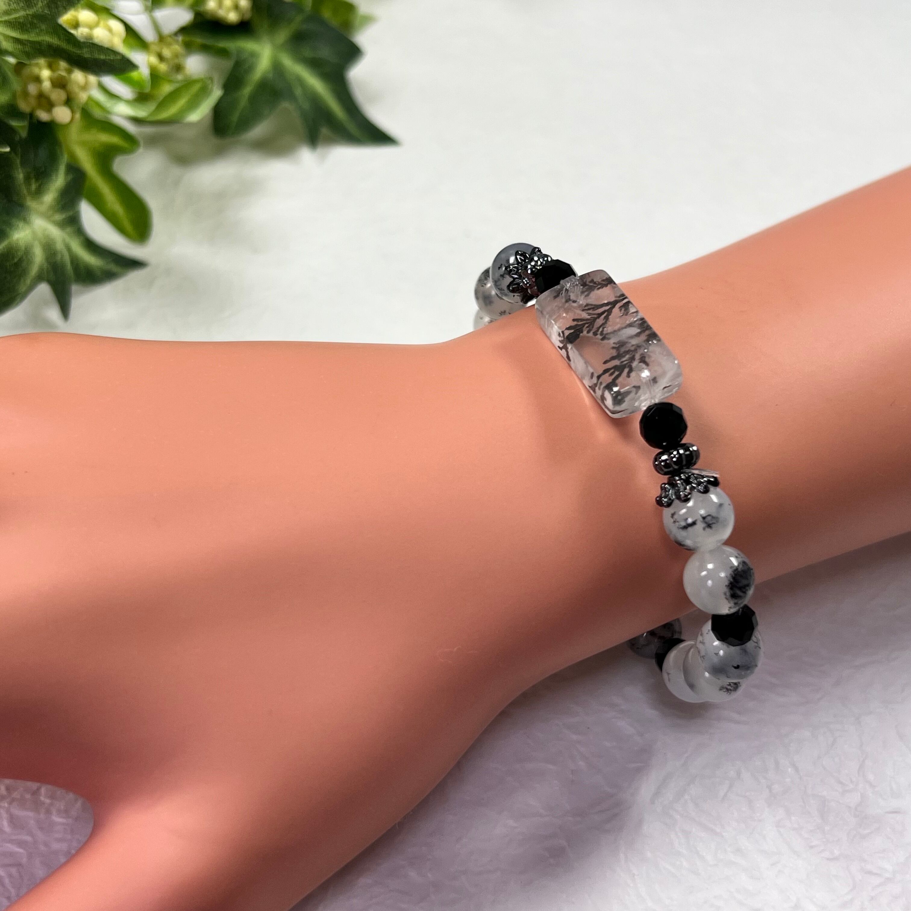このブレスレットは、デンドリクォーツと呼ばれる天然の石を使用しています。デンドリクォーツは、結晶内部に様々な模様が入った美しい石で、人気がある天然石です。自然の力を感じられるだけでなく、個々の石の模様が異なるため、一つ一つがオリジナルのブレスレットとなっています。