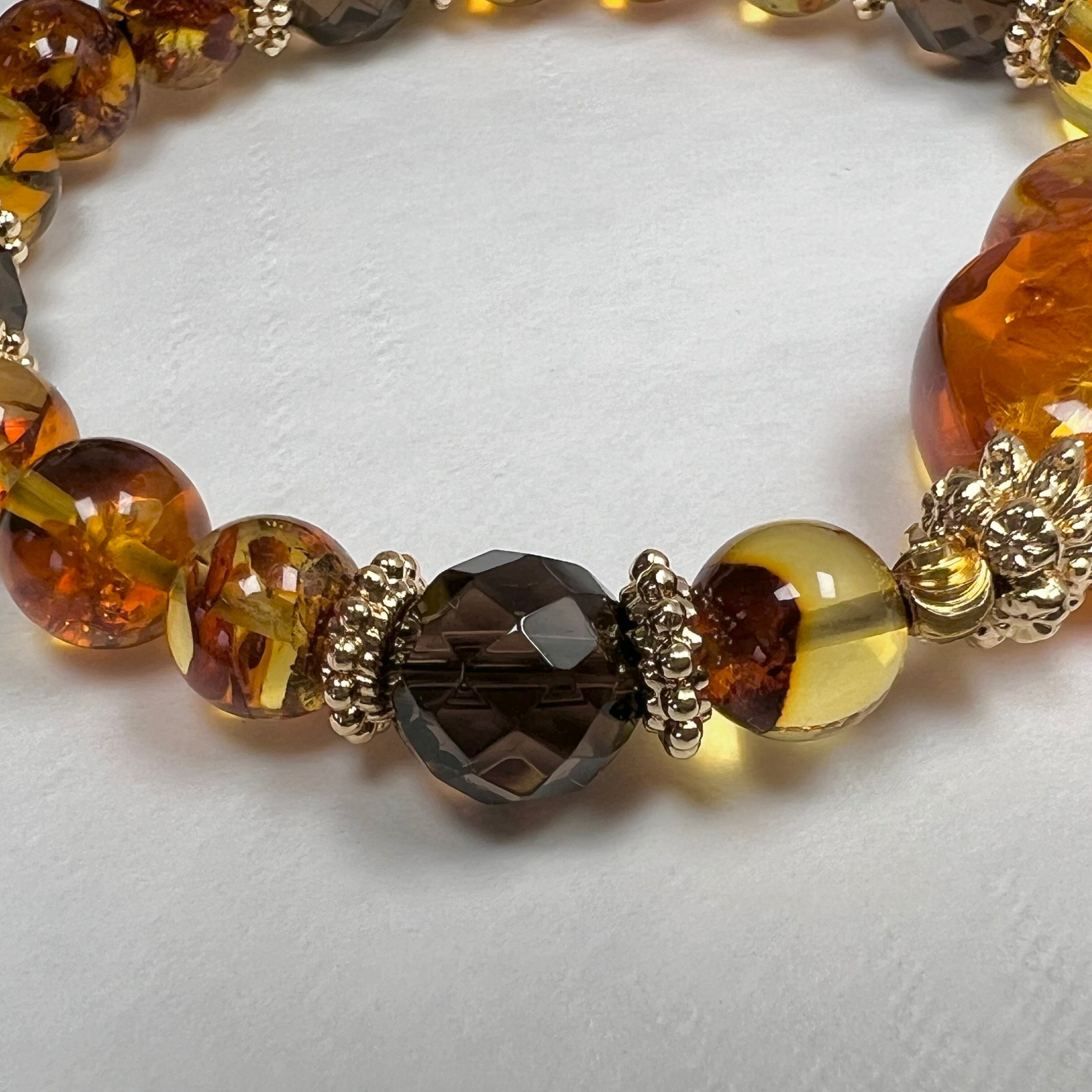 こちらは透明感が美しい、フラワーアンバーブレスレット。優しさと、輝きを合わせ持つアンバーが、華やかな印象を与えます。
