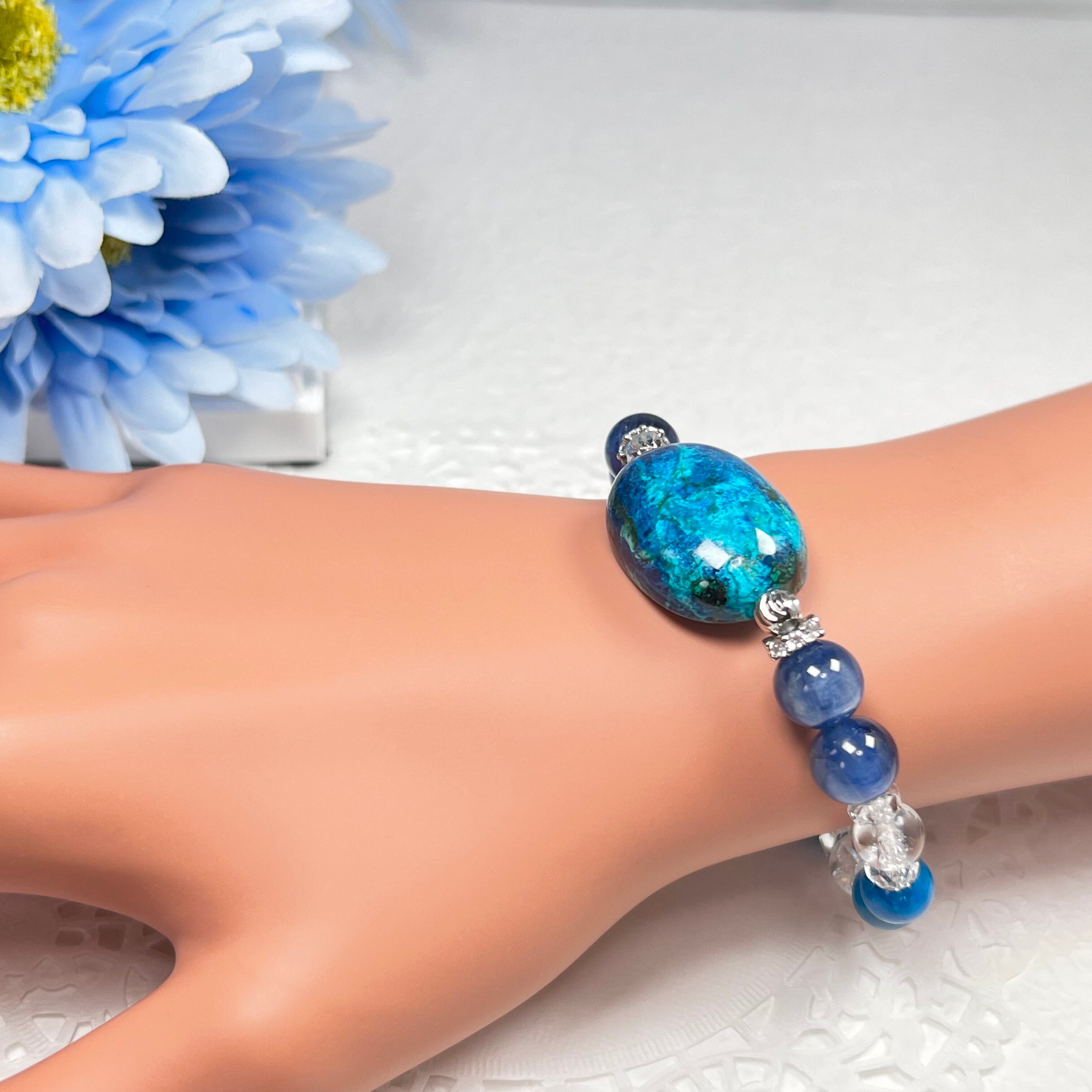 このブレスレットは、自然な色合いと鮮やかな模様が織り成すクリソコラ、水晶はフラワー水晶を組み入れ身につけるだけでさらに心が安らげそうなイメージでお作りしました。
