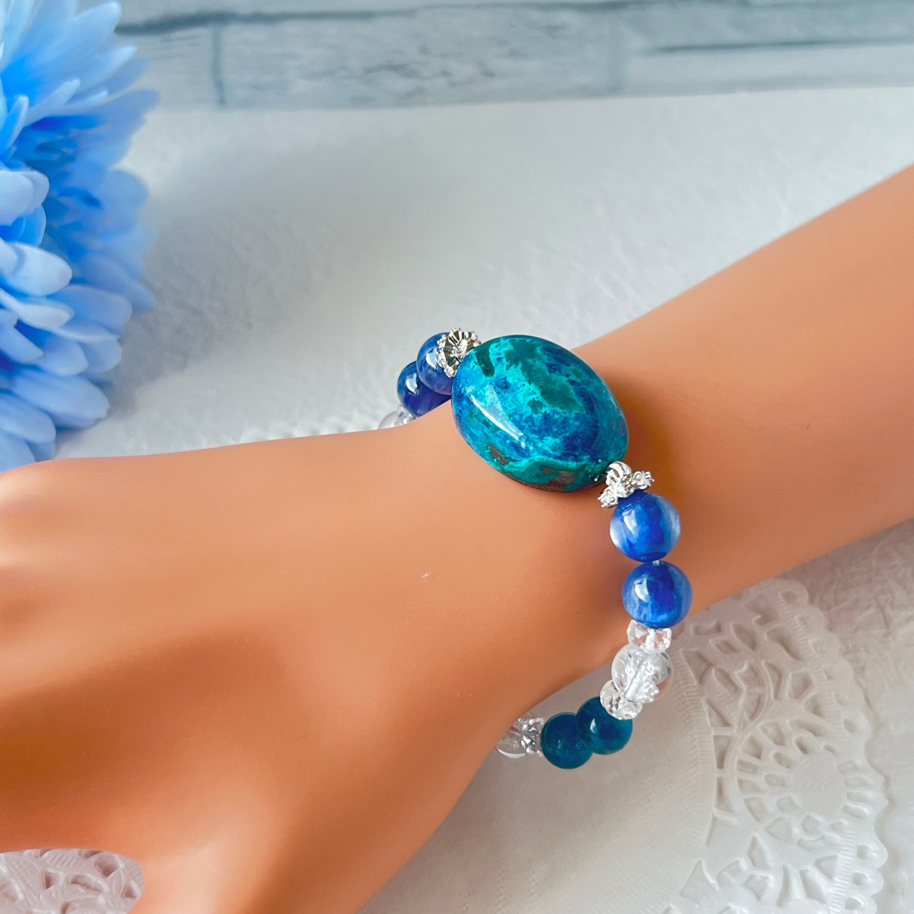 メインのクリソコラの色に合わせカイヤナイト、アパタイトと組み合わせ統一感を出しています。