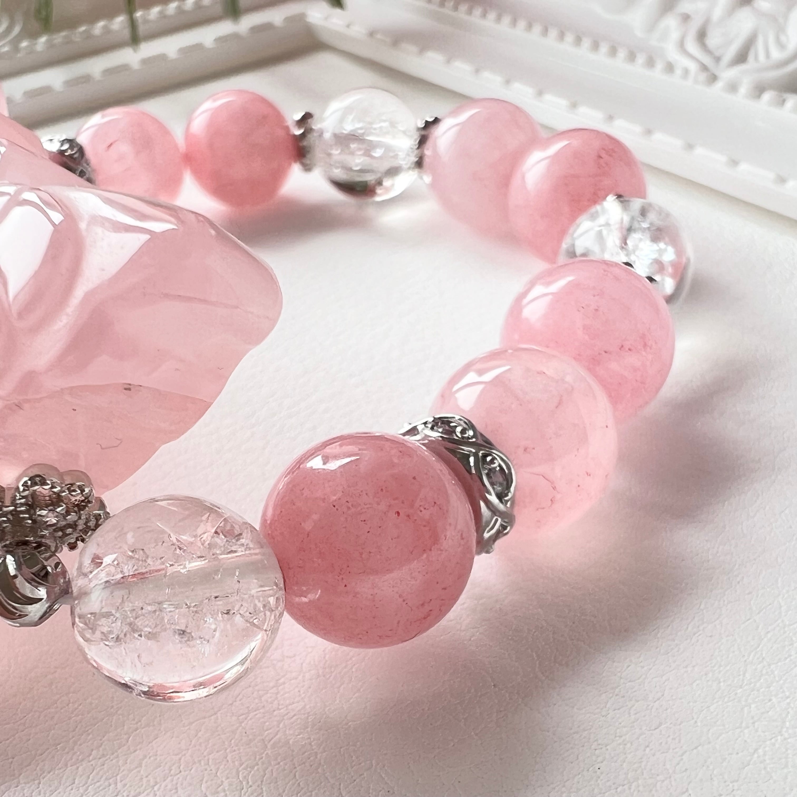 美しいローズクォーツの蝶々がメインのデザインブレスレット。天然石ならではの優しい色合いが、身に付ける人に安らぎとパワーを届けてくれます。