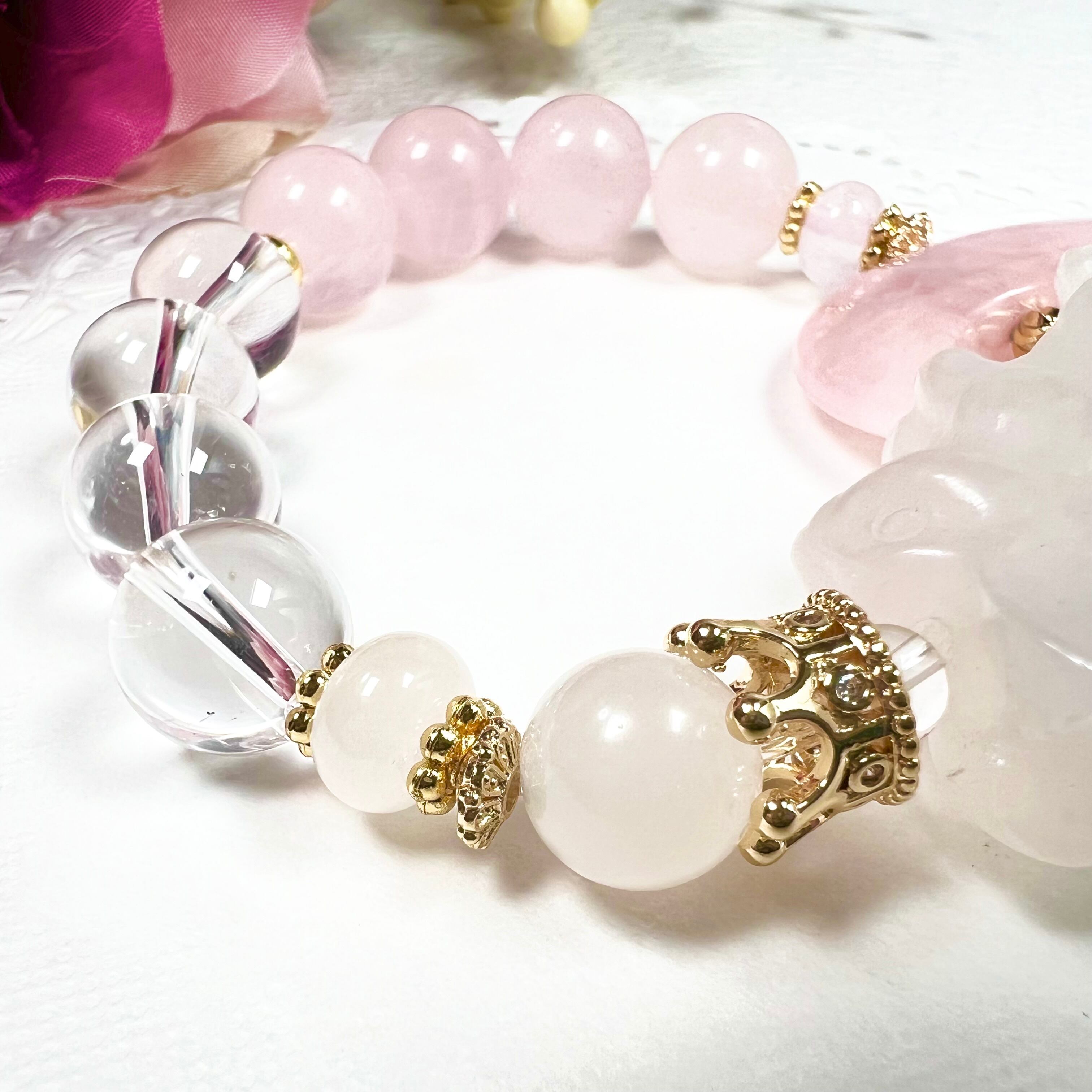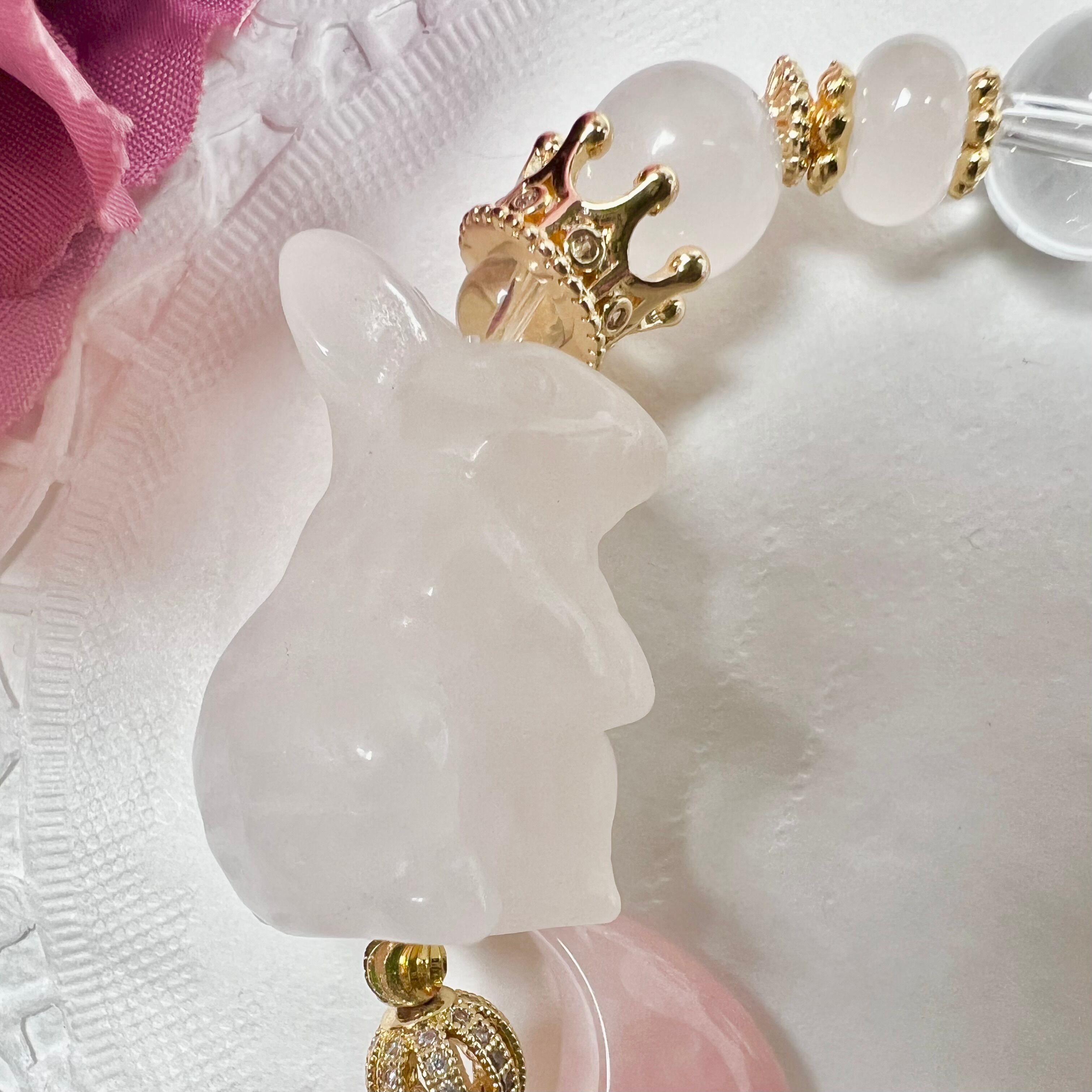 繊細なデザインのうさぎが愛らしさを演出し、水晶とローズクォーツの組み合わせが、パワーを与えてくれると言われています。水晶はクリアなエネルギーを持ち、ローズクォーツは愛情を育む石として知られています。
